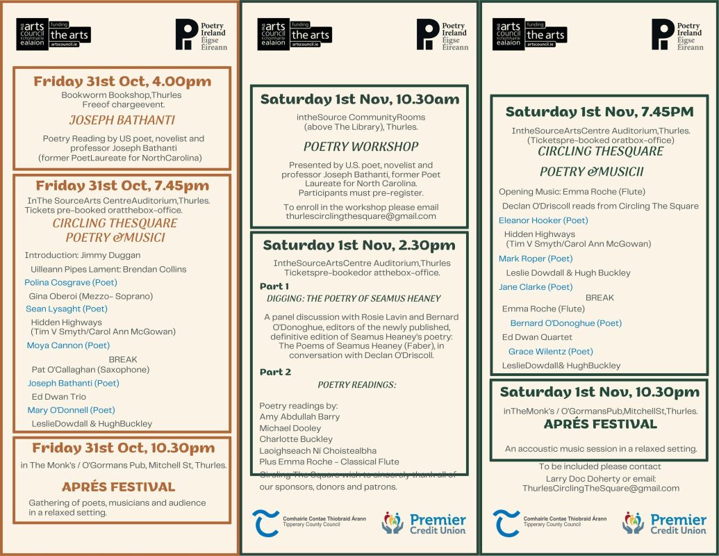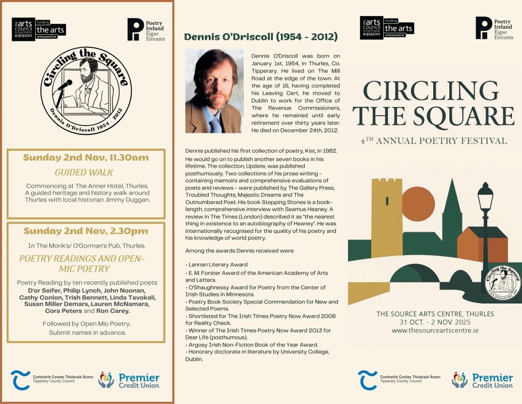 The 4th annual Circling the Square Festival comes back to The Source on the weekend of 31st October - 1st November. The festival honours Thurles-born poet Dennis O'Driscoll and welcomes many of the foremost poets from this country and beyond.